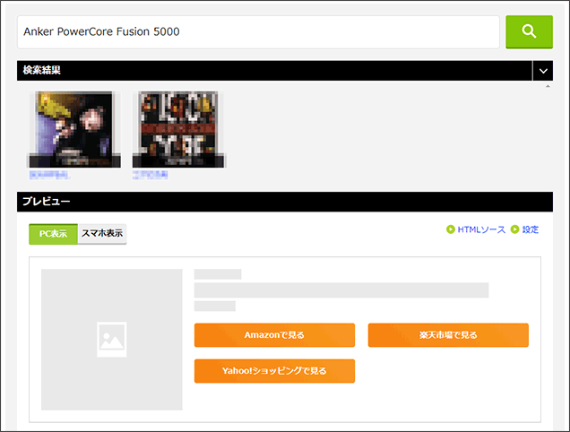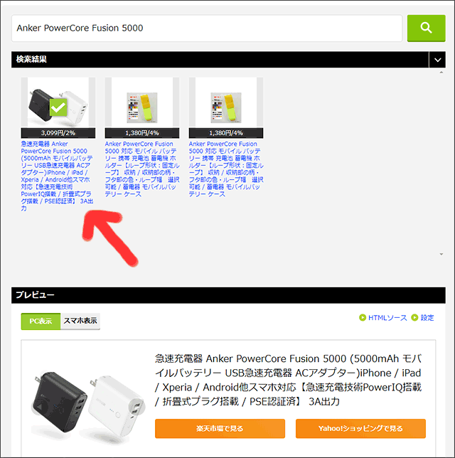 ④ 商品名を検索して、検索結果に表示されたものの中から、紹介したい商品を選択します。試しに「Ankerのモバイルバッテリー」を紹介してみます。