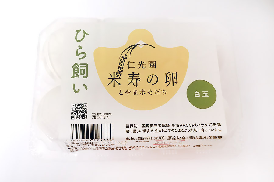 ▼富山県小矢部市、仁光園さんの「ひら飼い・米寿の卵」。飼料に富山県産米を使用しているそうです。抗生物質などの薬剤、合成添加物も使用していません。