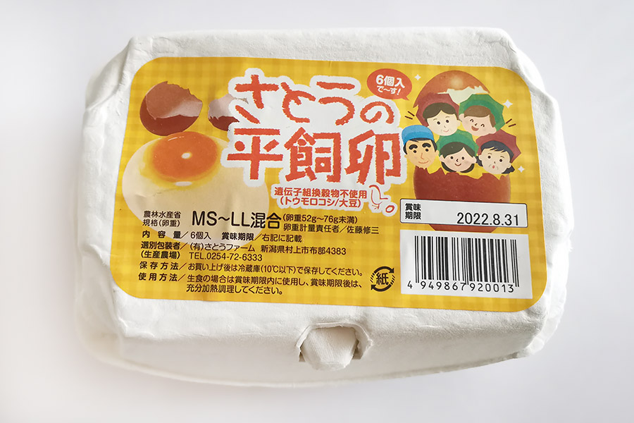 ▼新潟県・さとうファームさんの「さとうの平飼卵」。飼料はトウモロコシ/大豆だそうです。