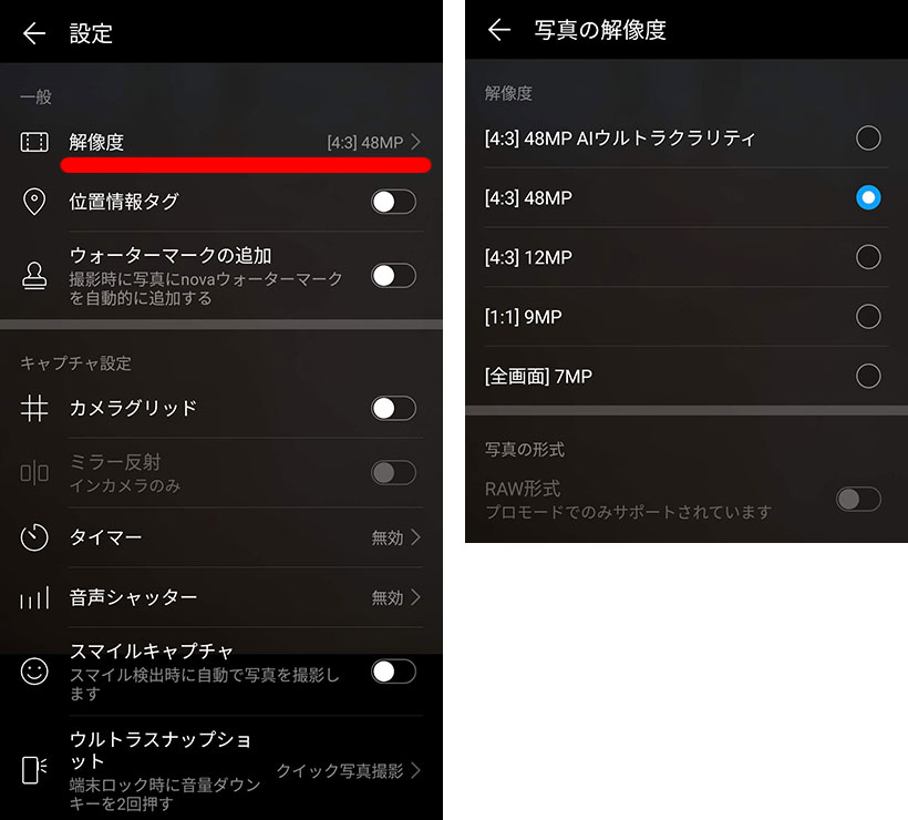 解像度は、48MP(48メガピクセル)の8000×6000pixelなど、5種類から選ぶことが可能です。一番上のウルトラクラリティは、静止したまま2秒ほどかけて撮る写真なので、高画質の静止画を撮ると非常にきれいです。もちろん、RAW形式での撮影も可能です。