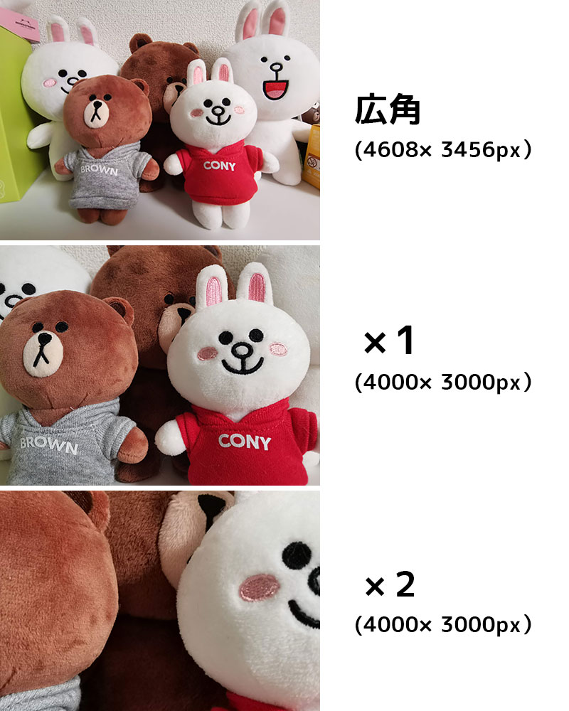 [4:3]12MP以下の解像度では、撮影時に広角モードを使用出来ます。全く同じ位置から、広角・等倍・2倍の3モードで撮影してみました。撮影画面の右側の〇部分を押すと、すぐに変更可能です。