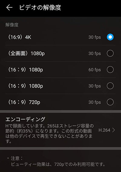 4Kビデオ(3840×2160px)を撮影することが出来ます。こちらもかなりの綺麗さです!インカメラにして、自撮りをする時は、下の方の解像度にするとビューティーモードが利用できます。投稿動画など撮影する時にも便利ですね!