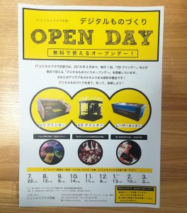 2019年3月まで、毎月「3Dプリンタ」などが無料で使えるオープンデーがあります。立体物への印刷や制作を試してみるチャンスです。持ち込みするものは不要だそうなので、ぜひ一度見てみてはいかがでしょうか。