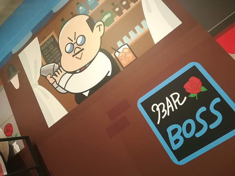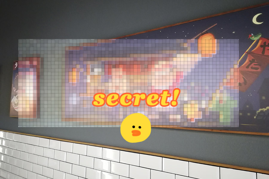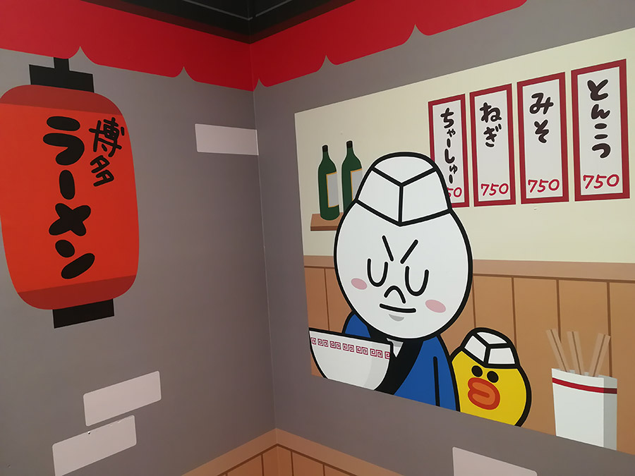 こちらはフォトスペース!?壁が鏡になっていて、こうやって写真を撮ると、イラストと一緒に写真が撮れます。博多っぽいラーメン屋さんのイラストですよ!