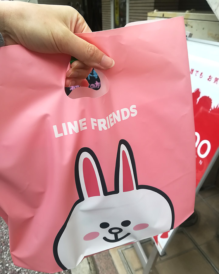 買い物したら、こんな可愛い袋に入れてくれました。反対側はチョコちゃんです。これを持って街を歩くのがちょっと恥ずかしいかなって人は、別に袋を持っていってくださいね。捨てるのはもったいない袋です!!