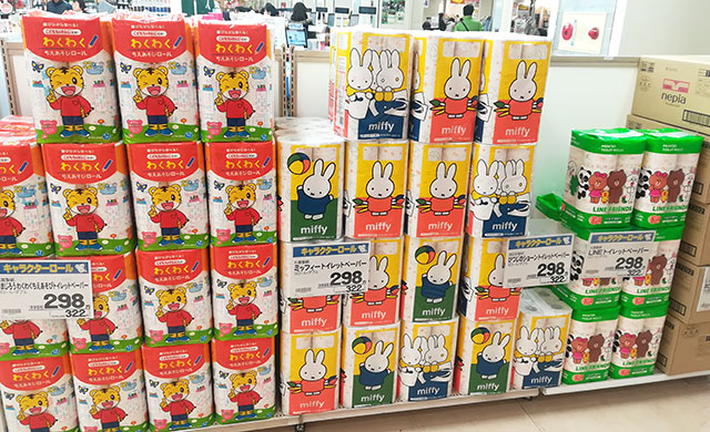 キャラクターのトイレットペーパーを大量に入荷してくれたらしく、一瞬で目につきました!!しかもかなり人気らしく残りわずか。もちろん迷わず購入!!次に行った時にはLINEのだけ売り切れていたので良かったです・・・。これからはネットで買わないと。