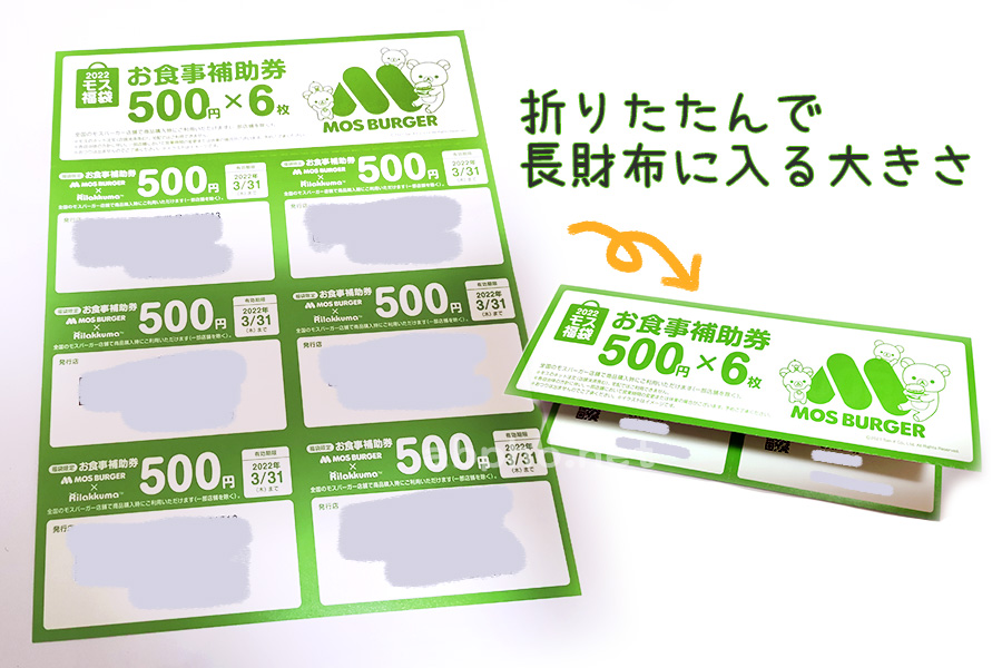 500円×6枚です。1会計で複数枚利用できますが、おつりは出ないそうです。一人だと800円代のお食事で終わってしまうので、モスチキンを追加しようかな・・・!とか思ってしまいますね。画像で消してある部分は受け取り店のハンコが押してありますが、全国で使用できます(一部店舗除く)