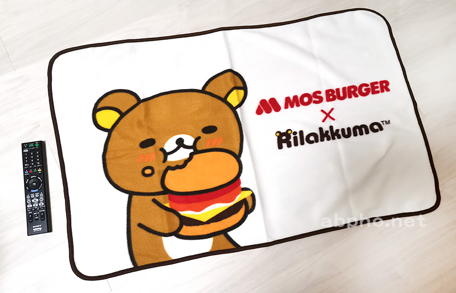 最後はブランケット!大きさが分かりやすいようにTVリモコンを置いてみました。モスチーズバーガーを食べるリラックマのオリジナルイラストがとても可愛いです。ここで初めて気づきましたが、リラックマのロゴはRに耳が付いているんですね!