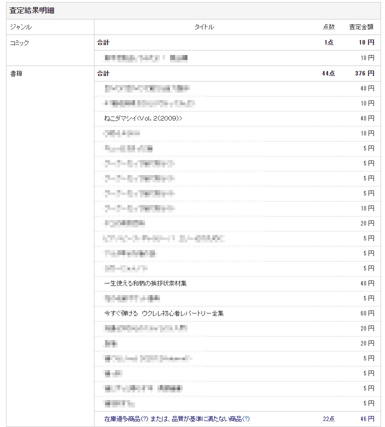 5~10円が多いですが、「ねこダマシイ」という10年以上前のムック?、「一生使える和柄の挨拶状素材集」「今すぐ弾ける ウクレレ初心者レパートリー全集」が少し高かったです(といっても50円前後ですが)