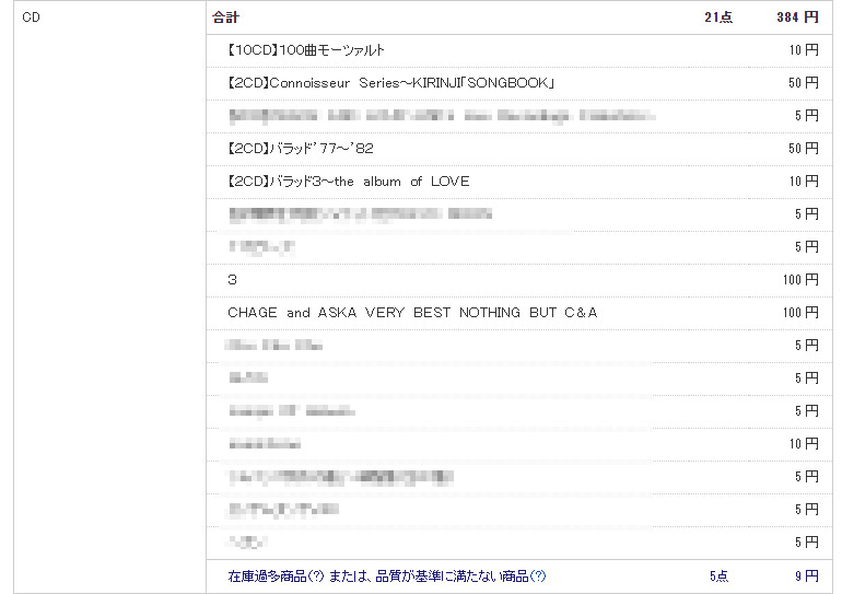 サザン、チャゲアス、キリンジのCDが50円近く付きましたが、5円、10円という値段がついたものもあるので、CDによるって感じだと思います。相当売れているものは5円です。