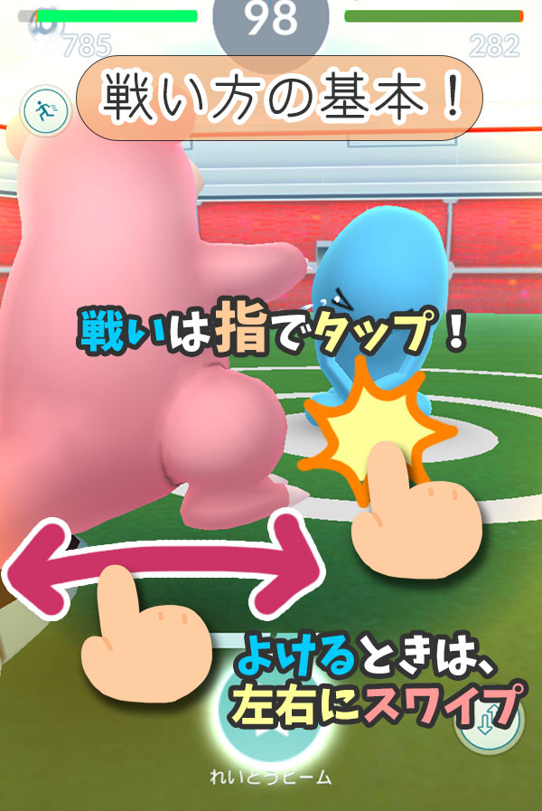 相手のコンピュータも「たまると出せる技」を出してきます。カビゴンのはかい光線・ナッシーのソーラービーム・シャワーズのハイドロポンプが直撃すると一気に体力(HP)がなくなってしまいます。相手ポケモンの動作が変わったら、左右にフリック!避けられれば少しのダメージですみます。ただ、このタイミングが微妙。ポケモンによって動きが小さかったり、避けたのに早すぎたとか・・・!
