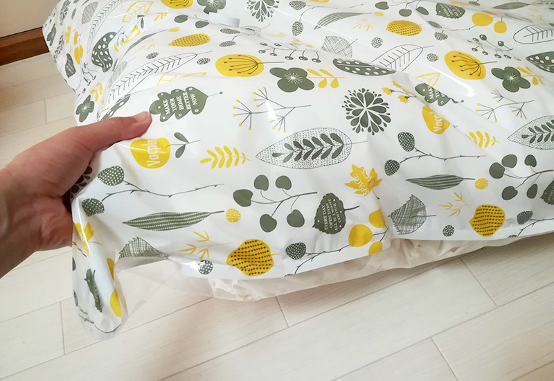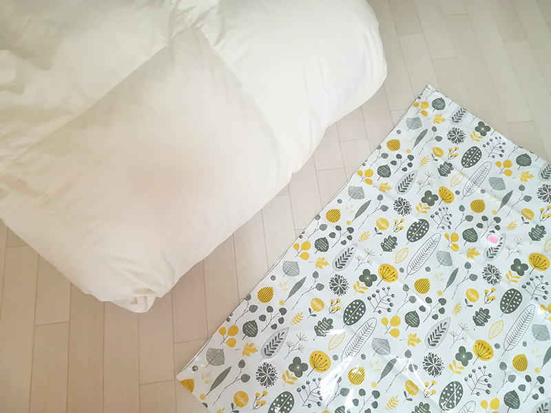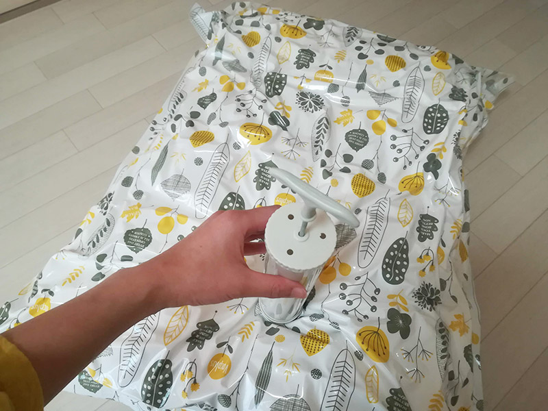 ふとん圧縮袋は、毎年使っています。掃除機で空気を吸うものを使っていました。掃除機をはめて吸い出すのって、布団自体を吸ってしまったりして、結構たいへんなんですよね・・・(;;)しかも、昨年は100均の圧縮袋を使ってみましたが、すぐに空気が戻ってしまい、ただのビニール袋のようでした。