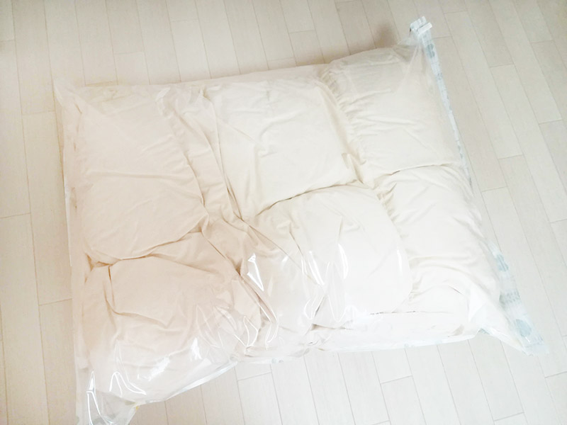 うちで厚めの布団は2枚だけ。3枚セットなので、あとの1枚は毛布やコートなどいれて圧縮してみようと思っています。とても丈夫なので、来年以降も繰り返して使えそう。コスパがとても良いです!!